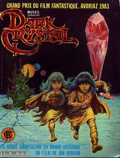 Puisque nous sommes sur C.A.P et que nous nous intéressons à toutes les formes d’art populaire, nous terminerons cet article par la novélisation du film sous forme de bande-dessinée. Effectivement, même pas un an après le tournage de DARK CRYSTAL, l’éditeur Marvel, toujours friand des adaptations sous forme de comic-book, publiait un « graphic novel », une bande dessinée de 48 pages réalisée par le scénariste David Anthony Kraft et le dessinateur Bret Blevins, bien aidé par l’encrage de Vince Coletta et surtout la superbe mise en couleur de Rick Bryant & Richard Howell.