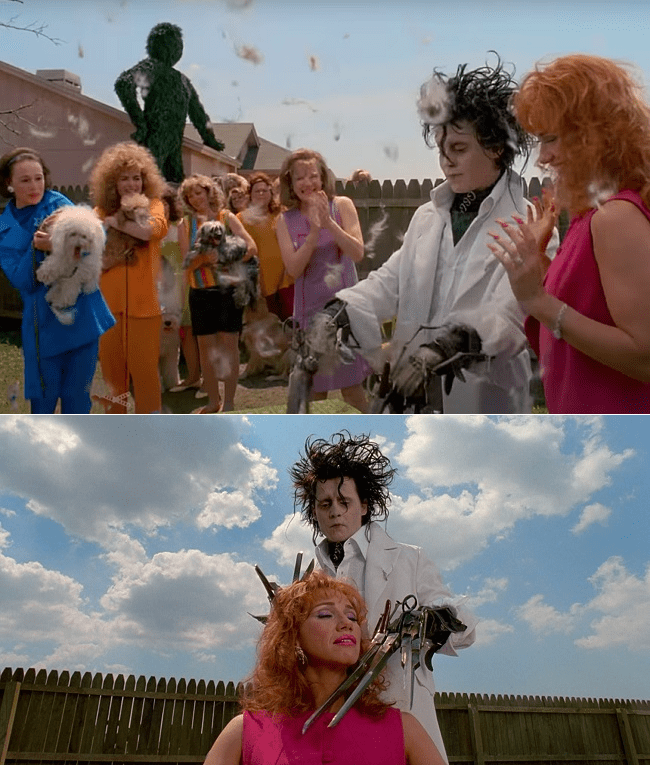 Il faut voir évoluer cette petite ville, véritable suburb métaphorique, d’abord uniforme, puis transformée physiquement par la personnalité originale d’Edward, devenir glaciale et menaçante au nom du refus de la différence !