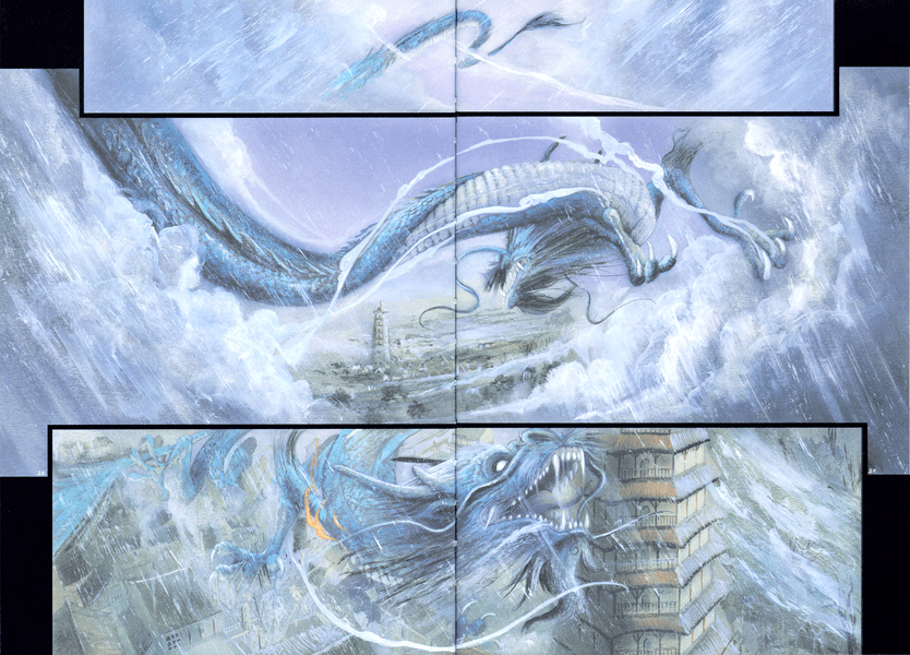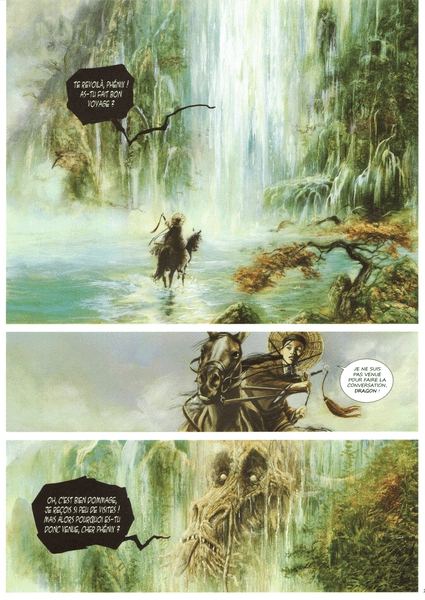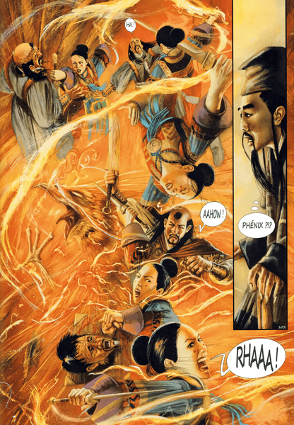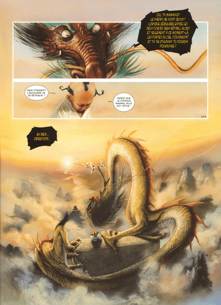 Le premier tome pose les bases, les enjeux et problématiques. Il est un peu ardu mais mérite qu’on fasse un effort. Par la suite, on est davantage dans le récit d’aventure et moins dans la politique. Et le dessin d’Emmanuel Civiello vient magnifier ces décors et costumes traditionnels chinois de toute beauté. Il y a bien quelques fois de légers soucis d’anatomie (j’ai trouvé parfois des têtes trop grosses par rapport au corps) mais c’est pour chipoter. Globalement le trait du dessinateur (et les couleurs) restitue parfaitement cette ambiance chinoise des temps anciens. Les planches mettant en scène les dragons ou les affrontement mystiques sont de véritables fresques mythologiques à tomber par terre. Malgré un trait quelque peu figé (car ça ressemble davantage à de la peinture, Civiello travaillant également en couleurs directes), on ressent du dynamisme dans les scènes d’action.