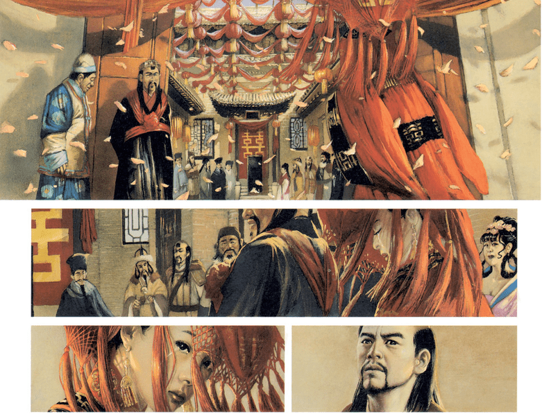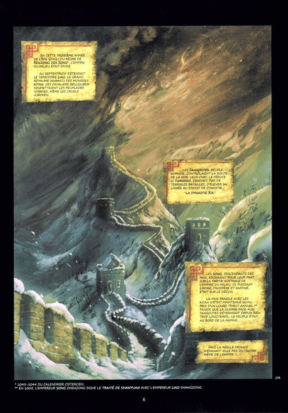 Bon, on ne va pas se mentir, la lecture de cette aventure n’est pas aisée pour le profane. Il faut assimiler le contexte géopolitique de l’époque (surtout dans le tome 1 qu’il faut lire à tête reposée.) Il est vrai que si on connait un peu l’histoire, on comprend mieux certaines choses. Comme par exemple le fait que la dynastie des Song fut une dynastie d’un grand épanouissement culturel et artistique qui s’était affaibli militairement au profit de son raffinement. C’est pourquoi ils ont acheté la paix auprès des barbares en payant des tributs. Par exemple auprès des Xia qui se sont imposés. Historiquement, c’est une période située entre les guerres de la période des Cinq Dynastie et des Dix Royaumes et celle de l’invasion mongole de Gengis Khan.