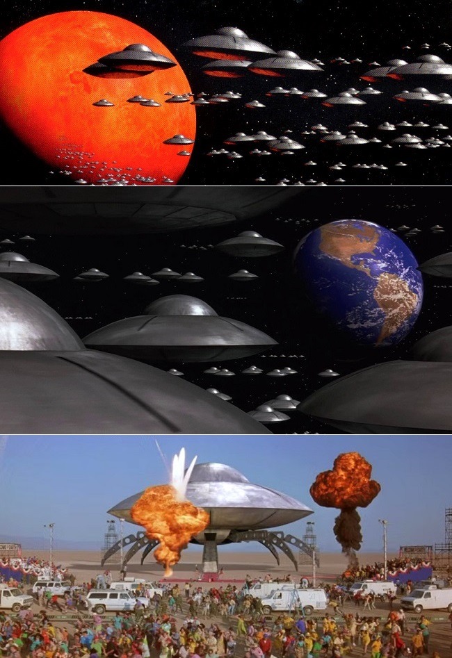 Visuellement, le résultat est extraordinaire. Après le (somptueux) noir et blanc d’ED WOOD, MARS ATTACKS ! multiplie les couleurs flashy et criardes sous la houlette d’ILM qui gère les effets spéciaux à coup d’images de synthèse qui tiennent la route encore aujourd’hui. Burton en profite, bien évidemment, pour rendre hommage aux grands classiques du genre (le genre “SF série-B : rayon invasion extraterrestre” !) avec, en avant-poste, les incontournables américains des années 50 (LA GUERRE DES MONDES (1953), LES SOUCOUPES VOLANTES ATTAQUENT (1956) dont il reprend le design des soucoupes et leur mode de déplacement délicieusement poétique, PLANÈTE INTERDITE (1956), LES SURVIVANTS DE L’INFINI (1955), voire le beaucoup plus confidentiel THE BRAIN THAT WOULDN’T DIE (1962), film de chevet de notre cinéaste), et même le tout aussi incontournable PRISONNIÈRE DES MARTIENS du tout aussi incontournable réalisateur nippon Hishiro Honda, le créateur du GODZILLA originel !