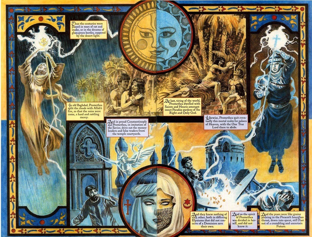 Promethea étant une héroïne qui possède le pouvoir de l’imagination, elle est désormais capable de franchir toutes les strates du réel et de l’imaginaire, passant de la réalité au rêve, de la matière à l’immatériel, de la vie à la mort, du présent au futur, d’une dimension à une autre, d’un espace à son contraire, etc.