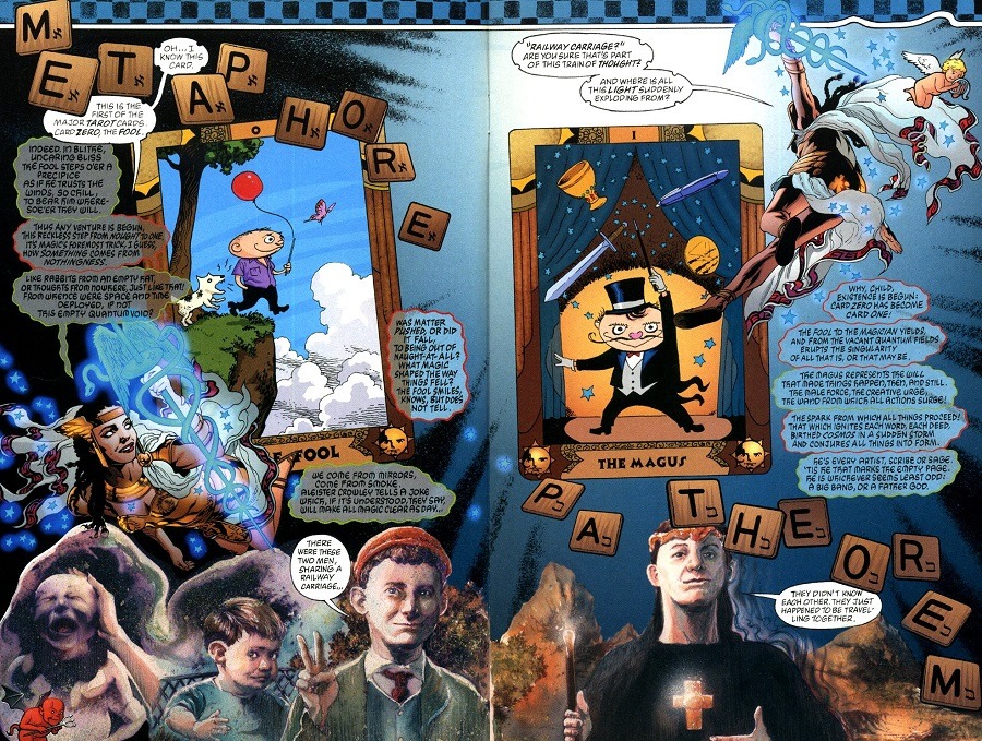 Le fan du créateur de WATCHMEN le sait : Moore est un féru de magie et il s’emploie ici à tisser une allégorie de la destinée humaine par le truchement de cette notion. C’est très difficile à expliquer, il faut le lire pour le comprendre : Point de vignettes, mais des doubles pages mêlant le texte et les images, sur la base d’un jeu de Tarot avec une carte au centre de chaque page. 22 cartes en tout, autour desquelles l’héroïne questionne les arcanes de la magie et de la création ! Dans le quart inférieur, un deuxième récit symbolique vient illustrer l’idée que tout n’est peut-être qu’illusion ou affabulation collective !