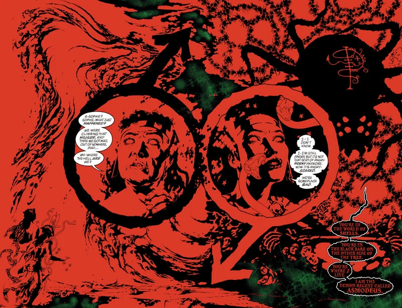 Pour terminer, quelques mots encore sur l’art de J. H. Williams III : La structure des planches se sera développée sur le même principe depuis le début de la série : Une composition symétrique psychédélique (mais parfaitement limpide !) sur deux pages, plus ou moins divisée en vignettes évanescentes. Des vignettes que l’on aura vu devenir des soleils ou des végétaux, qui se seront lovées dans les bras d’une pieuvre démoniaque ou bien dans les cheveux d’un ange. Des cadres plus ou moins figuratifs selon le contenu sémantique, décorés de volutes, de flammes ou de frises gréco-romaines.