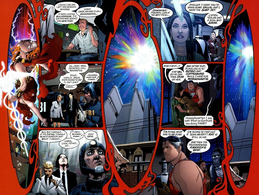 Le temps de trois épisodes, J.H. Williams III s’essaie un peu à tous les styles en faisant cohabiter les héros des séries TOM STRONG et TOMORROW STORIES, unis afin de reformer l’équipe des America’s bests, une sorte de parodie de la JLA au sein de la ligne ABC créée par Alan Moore. Il adapte son trait et s’arrange pour que chaque personnage soit dessiné de la même manière que dans sa série d’origine, inventant ainsi le principe du crossover conceptualisé, qui regroupe aussi bien les divers héros d’un même éditeur que le style de chaque dessinateur concerné par leur création !