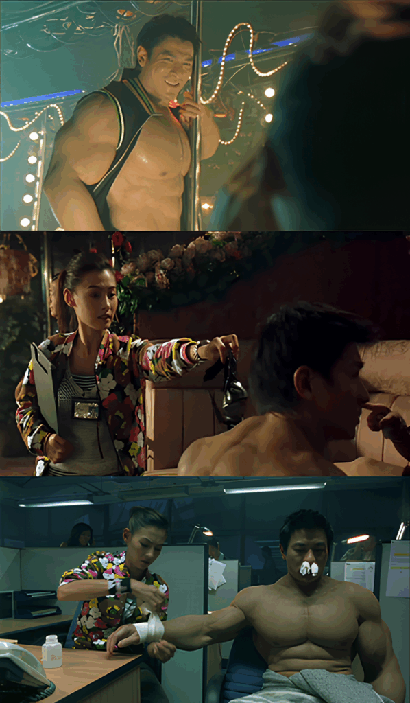 L’histoire est celle de Big (joué par Andy Lau), un ancien moine bouddhiste devenu strip-teaseur culturiste (oui, oui !). Alors qu’il est sur le point de se faire arrêter pour exhibitionnisme par la jeune inspectrice Lee Fung-Yee (jouée par l’adorablement angélique Cecilia Cheung), Big parvient à s’enfuir (tout nu) dans la rue et croise un meurtrier en fuite poursuivi lui aussi par des hommes du CID. Il s’avère que ce meurtrier est un indien contorsionniste qui peut se glisser dans des endroits très exigus (rien que ça !) L’inspectrice laisse tomber temporairement la poursuite de Big pour se concentrer sur l’indien mais alors qu’elle lui tire dessus, elle manque sa cible et abat un chien policier. Big se fait arrêter par d’autres policiers et échange un regard avec le chien mourant. Il a une vision lui montrant un jeune garçon qui maltraite un chiot à l’endroit où git le chien agonisant. Ce n’est pas clair tout de suite mais on est censé comprendre que ce chien qui vient de mourir était le garçon cruel dans une vie antérieure. Rattrapé par son karma, il est devenu lui-même un chien, et il est mort.