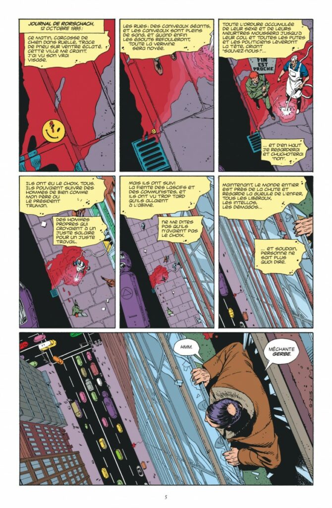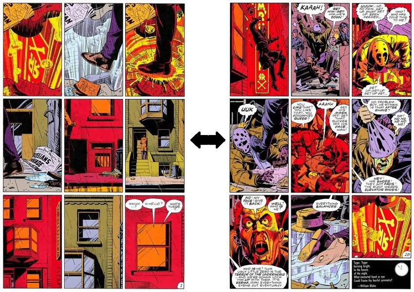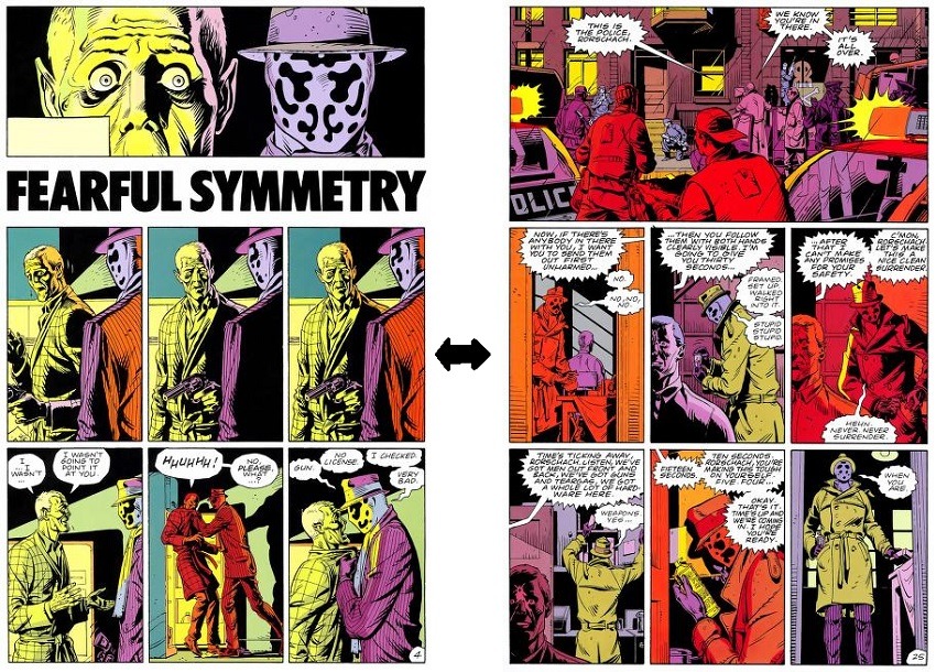 Le titre étant à double sens (le mot “Watch”, en anglais, signifie “surveiller”, “garder”, autant qu’il désigne une montre ou une horloge), WATCHMEN est découpé selon une construction rigoureuse qui impressionne encore aujourd’hui. À ce stade, Alan Moore est devenu un maitre de la construction narrative et il expérimente sous nos yeux un grand nombre de figures de style. Certains épisodes, pour ne pas dire la totalité du récit, sont construits quasiment à la manière d’un palindrome. On ne peut pas lire la chose dans les deux sens, certes, mais on a souvent le cas d’un final faisant écho au début, où l’on retrouve les mêmes vignettes en sens inverse (la dernière vignette faisant écho à la première et l’avant-dernière à la seconde, par exemple). Le cinquième épisode, intitulé TERRIBLE SYMÉTRIE, s’impose quant à lui un découpage dans lequel la première planche a son image-miroir dans la dernière, la seconde dans l’avant-dernière et ainsi de suite, chaque page possédant le même découpage que celle qui lui est associée, jusqu’à ce que la double page centrale soit construite elle-même sur une disposition symétrique.