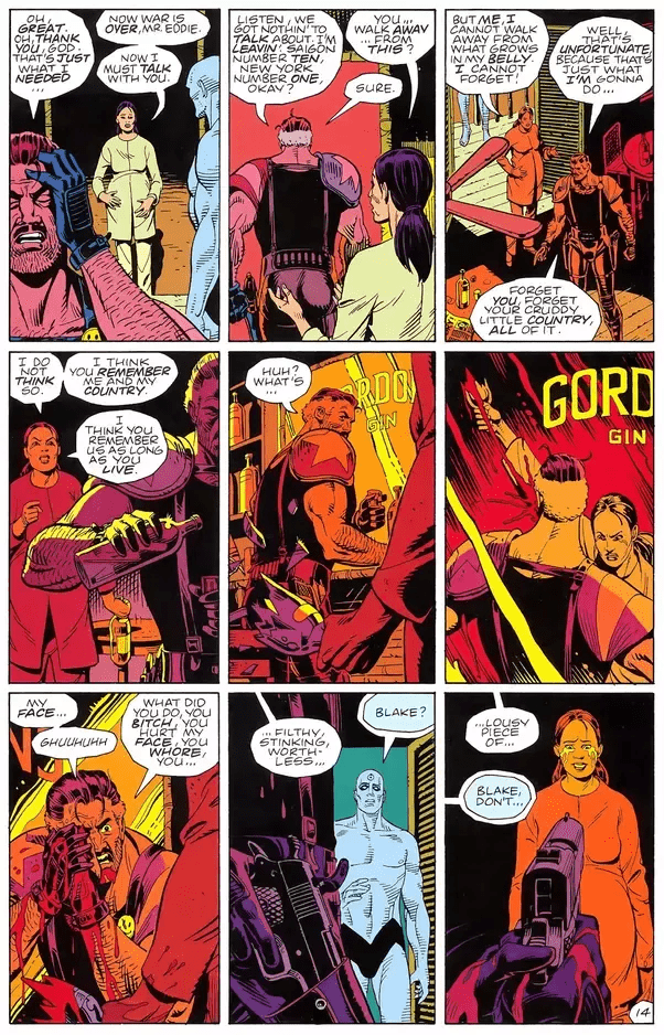 Auteurs : Alan Moore (scénario), Dave Gibbons (dessin), John Higgins (couleurs).