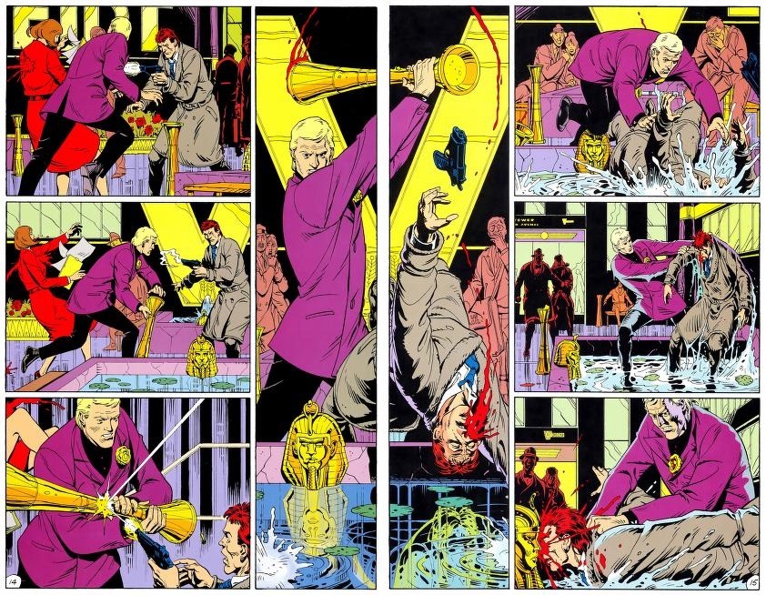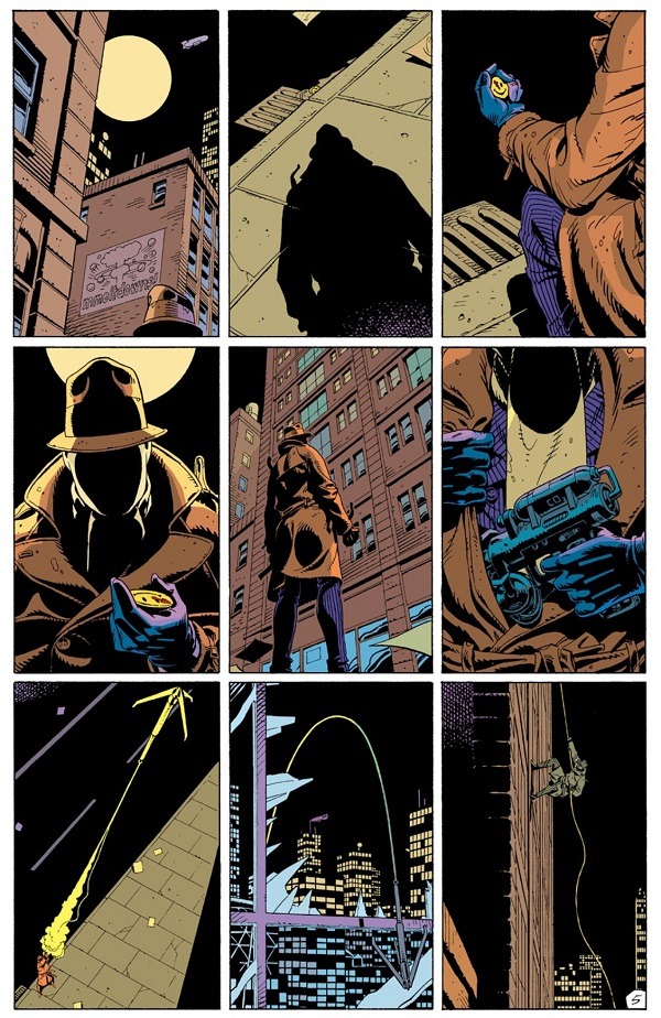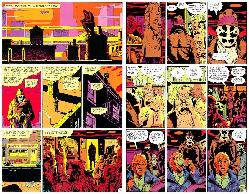 Puisque le récit est noir, autant le raconter à la manière d’un polar. C’est ainsi que nous suivons le journal de Rorshach comme nous avons pu suivre les soliloques de Philip Marlowe ou de Sam Spade sous la plume de Raymond Chandler ou de Dashiell Hammett. WATCHMEN emprunte les codes du polar avec ses enquêtes tordues et ses personnages troubles.