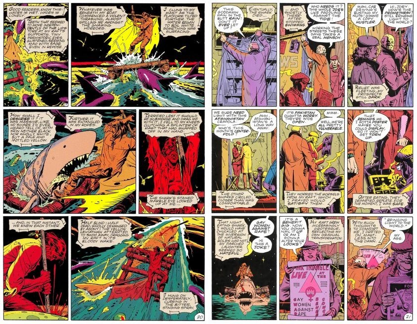 Au niveau de la construction de l’intrigue, Alan Moore va également développer une technique narrative qui traumatisera apparemment toute la profession puisqu’elle sera reprise ensuite dans un nombre considérable de bandes dessinées. Il s’agit des bons dans le temps et notamment des flashbacks, lesquels viennent à leur tour enrichir la trame de l’histoire, le développement des personnages et les fils de l’intrigue. Ici encore, le scénariste se montre brillant dans le découpage en associant des vignettes qui se font écho, le même dessin étant repris de l’une à l’autre, avec juste quelques changements de détails pour informer le lecteur qu’il est revenu dans le passé, par exemple.