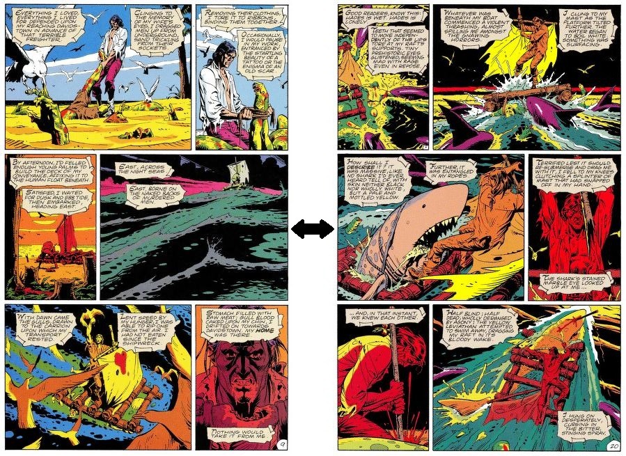 Toute la série est découpée selon un gaufrier de neuf vignettes de même taille sur chaque planche, modulables sur la largeur et sur la hauteur (deux ou trois, voire six vignettes peuvent fusionner pour n’en former qu’une, plus grande). Ce procédé faussement simpliste est en réalité d’une grande lisibilité mais aussi d’une grande richesse, comme on l’a vu avec l’idée du découpage selon la figure du palindrome. Ici encore, la rigueur côtoie la créativité, les auteurs jouant sans cesse avec les codes de l’art séquentiel dès qu’il faut se mettre au service du récit et de la manière de le raconter, en utilisant, comme au cinéma, des procédés d’enchainement, de fondus, d’échelles de plans, de champ/contre-champ, etc. Et ce qui était au départ très académique en termes de découpage, finit par être bourré de classe et de personnalité.
