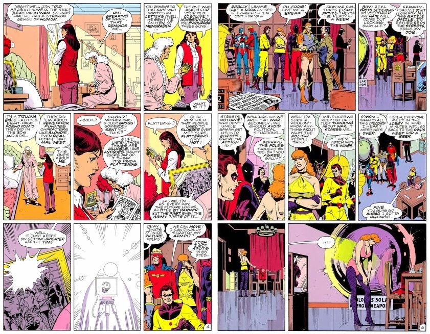 Dans sa phase de déconstruction, Alan Moore explique comment on passe d’un monde (celui où existent des super-héros au sens classique du terme) à un autre (celui où ils ne peuvent plus exister puisque le sujet, traité de manière adulte, est un non-sens).