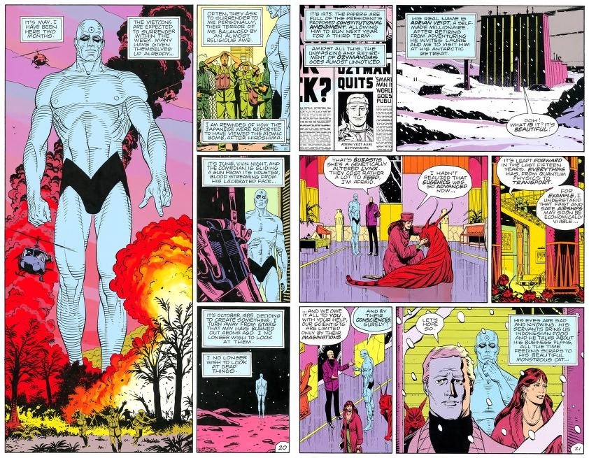 Ainsi, dans sa phase de déconstruction, Moore choisit cette fois de faire du super-héros un loser, un has-been pathétique lié à une époque révolue où l’on croyait naïvement à cette pantalonnade d’hommes et de femmes déguisés en panoplie flashy ridicule. Ces fameux surhommes sont, à une exception près (le Dr Manhattan, qui par sa supériorité écrasante met d’autant plus en valeur l’obsolescence de ses anciens acolytes), des hommes et des femmes banals, souvent vieillissants et bedonnants, parfois alcooliques, dépressifs et instables. On notera tout de même quelques exceptions avec Ozymandias, un “yes-man” égocentrique qui exploite son image pour créer un empire d’ordre libéral et, à l’opposé, Rorshach, un sociopathe continuant d’exercer son activité de justicier de manière illégale avec une obsession fanatique.